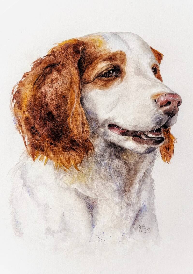 De prachtige roestbruine kleur van een kooikerhondje. Hier en daar valt het licht als goud op de vacht. Een feestje om deze kleuren met aquarelverf op papier te zetten.