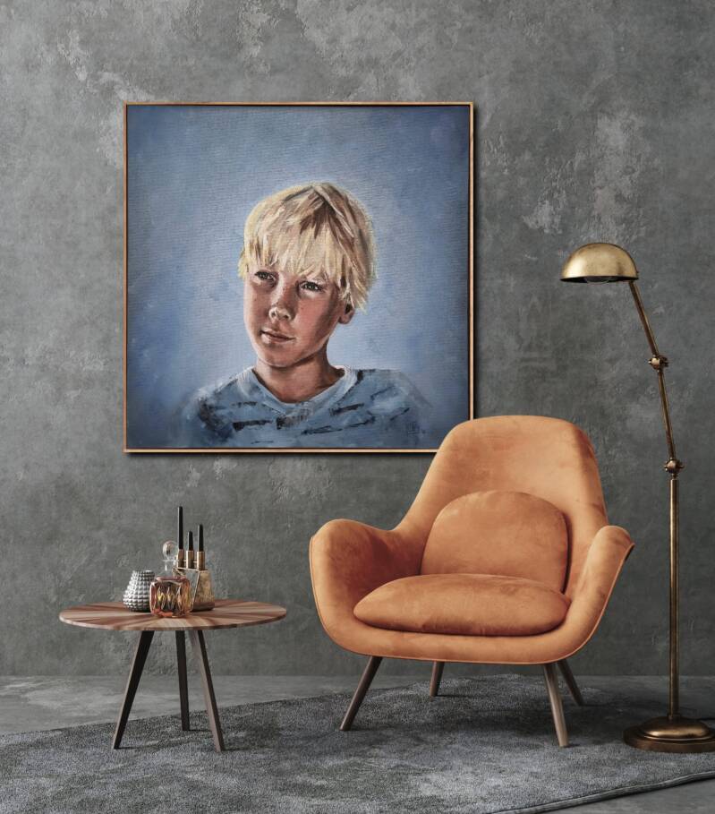 Mijn zoon, blonde haren, blauwe ogen. Olieverf is weer een totaal ander medium dan bv acryl- waterverf, inkt, pastelkrijt of houtskool. Bij het opdrogen verdiepen de kleuren zich enorm, wat bij dit portret goed tot zijn recht komt.