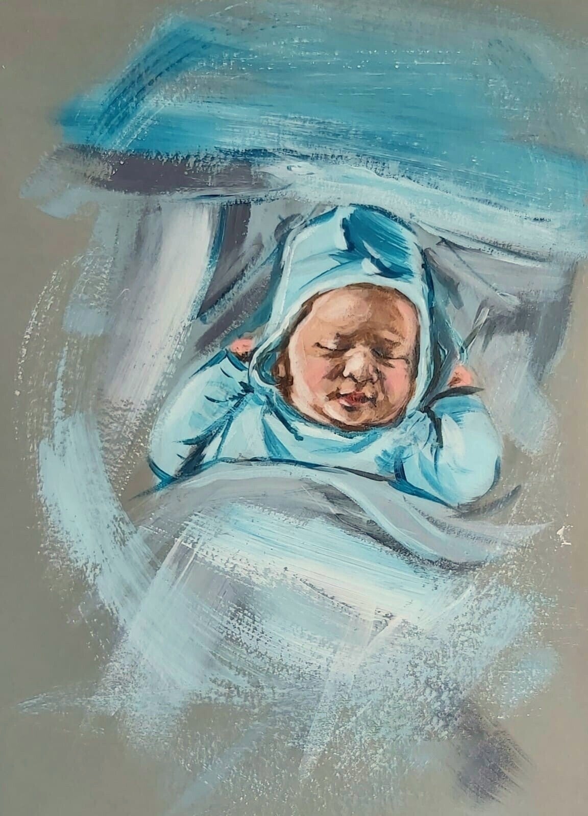 Geweldig vind ik het om iemand te verrassen met een schilderij of tekening. Dit was een geslaagd cadeau voor de ouders van dit pasgeboren kindje. Met een paar rake penseelstreken met acrylverf kwam dit mooie nieuwe mensje op doek. Welkom op de wereld kleintje!