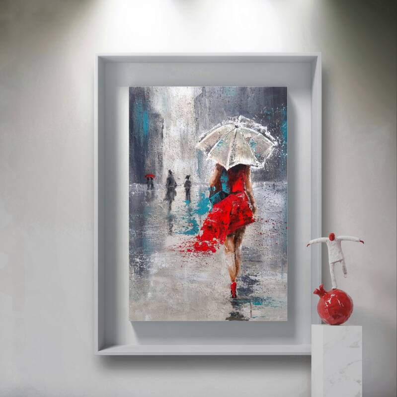 Op een regenachtige warme dag wandelend door de straten van een stad. Spelen met structuur, textuur en kleur. Een leuk weetje: in dit werk heb ik bouwzand van ons nieuwe huis gebruikt. Zand is een goed middel om mooie texturen en structuren te maken. In dit werk gaat de aandacht vooral naar de rode jurk. Merk je dat je ogen ook getrokken worden naar de rode paraplu in de verte? Een trucje om je blik niet alsmaar bij de dame met de paraplu te houden. Ook de blauwe kleur links op het werk zorgt ervoor dat je verder de straat in kijkt. De kracht van kleur en contrast! Naar een werk van Andre Kohn.